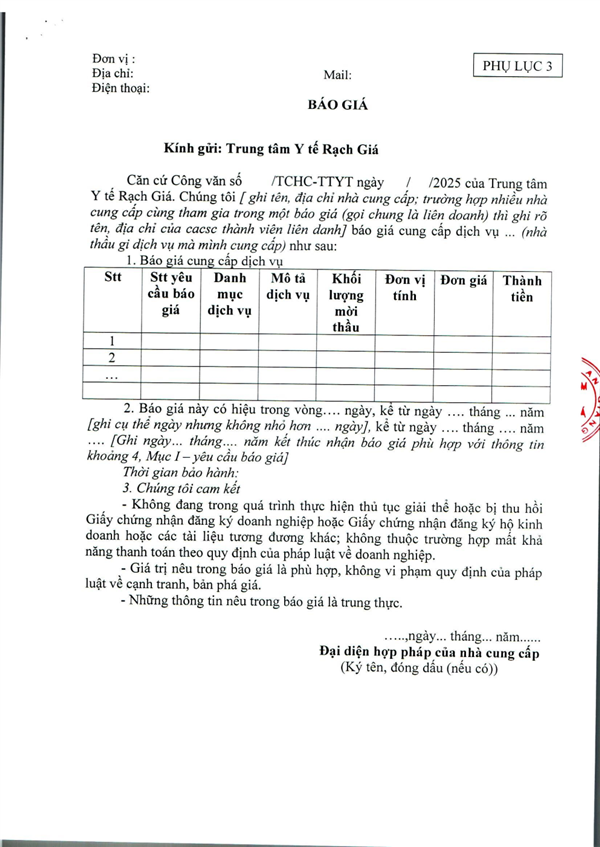 - V/v yêu cầu báo giá việc thẩm định giá tài sản, công cụ dụng cụ thanh lý tại Trung tâm Y tế thành phố Rạch Giá