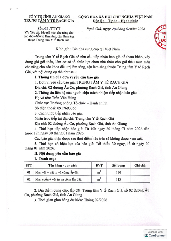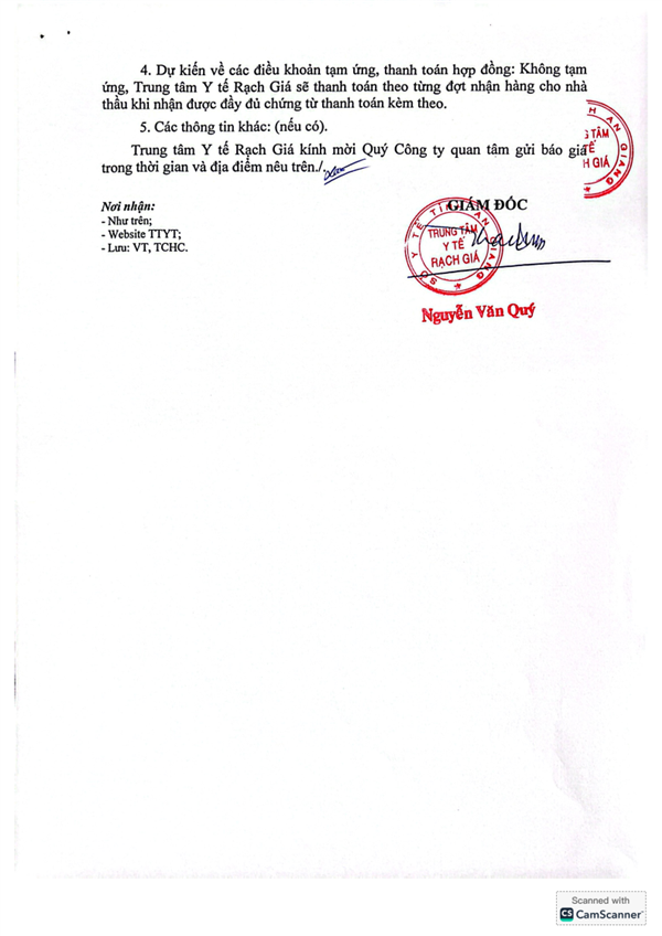 - V/v mời tham gia gói thầu: "Tư vấn lập E-HSMT và kết quả lựa chọn nhà thầu" Gói thầu "Mua sắm trang thiết bị, dụng cụ và linh kiện y tế tại Trung tâm Y tế TP Rạch Giá