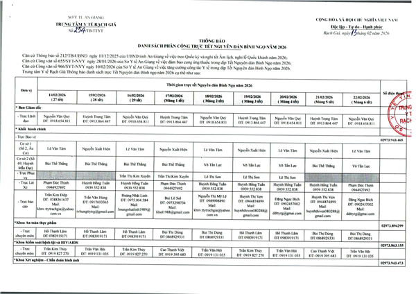 - (10/02/2026 10:18:00 AM) - THÔNG BÁO Lịch nghỉ Tết Nguyên đán Bính Ngọ năm 2026 tại Trung tâm Y tế Rạch Giá)